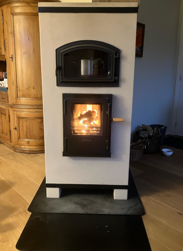 Koken met een oven in een houtkachel is een eeuwenoude traditie. In onze leemkachels integreren we daarom vaak een oven direct boven de vuurkern — precies op de plek die het warmst wordt.
